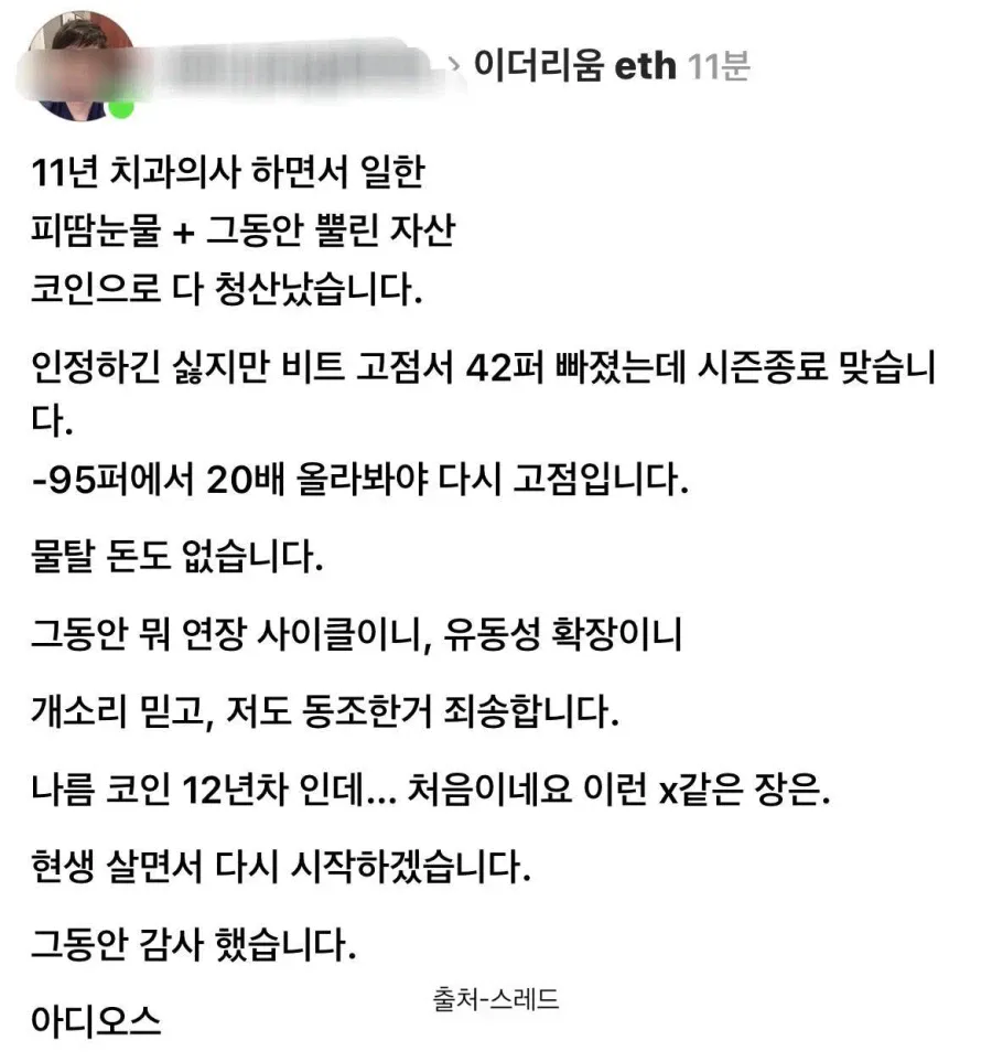 11년 치과의사 하면서 모은 돈으로 코인 투자한 근황 댓글 0 3시간전 작성자 : 공룡 좋아요 팔로우 게시글 보기 공룡님의 최신 글 02.04 늙었다는 것은, 살아 남았다는 것, 살아 남았다는 것은 02.04 이번에 밀가루값 답합 딱걸린 대기업들 근황 02.04 난리난 한국 원전 업계 근황 02.04 코스피 5000 간다더니... 붕괴,급락 왜? 02.04 토스 대규모 채용이라서 구경 해봤더니... 02.04 여군은 왜 "나라사랑카드" 안주나요? 02.04 주사맞기 무서워하는사람 봐라 02.04 삼성전자 1,000조가 얼마나 무서운 수치인지 알려줌 02.04 혼돈의 일본 정치판 근황 02.04 "저 신민아 닮았나요?"