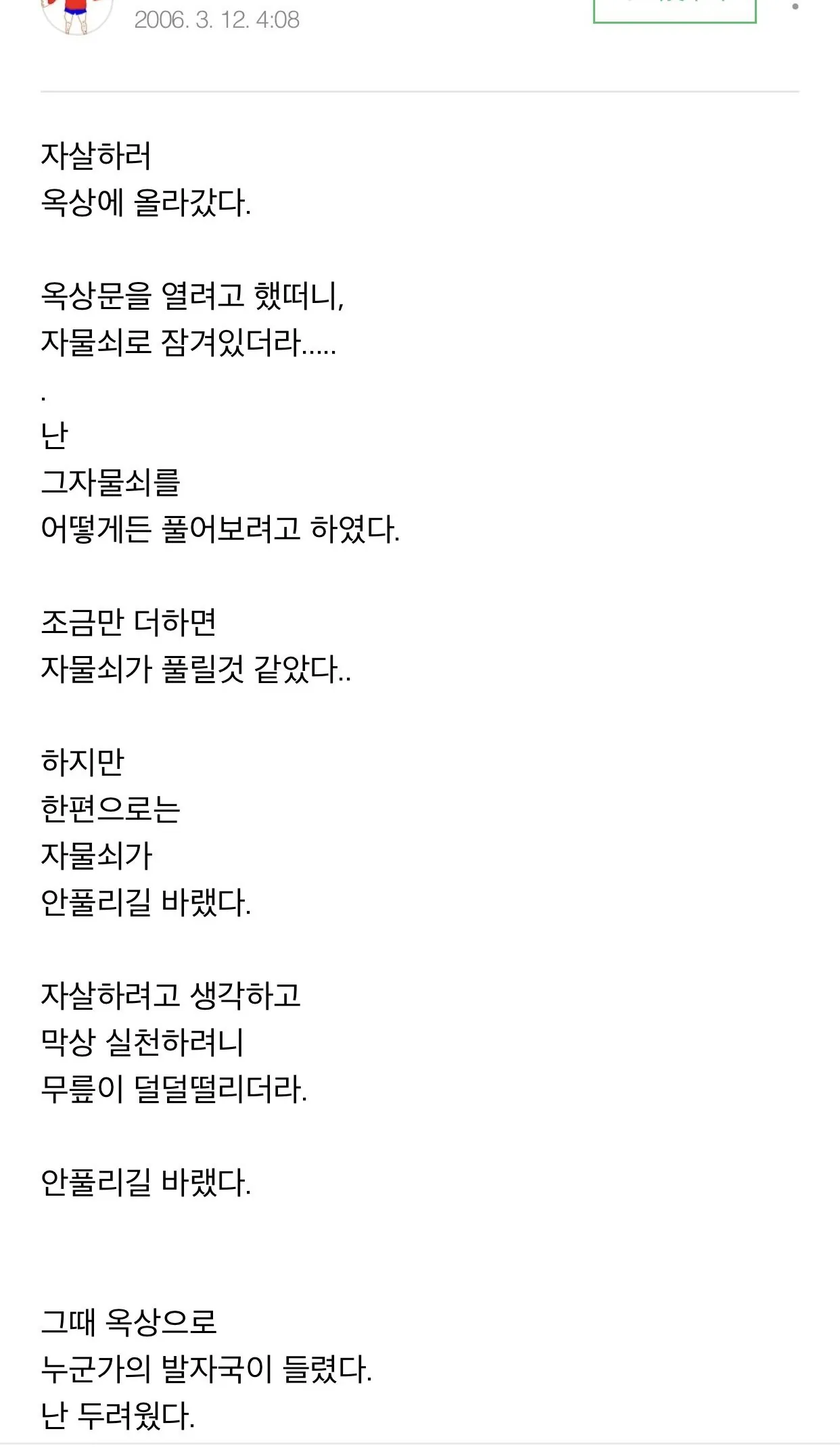 20년전 자살한 씁쓸한 네이버 블로그 글 댓글 0 1시간전 작성자 : 공룡 좋아요 팔로우 게시글 보기 공룡님의 최신 글 02.05 예비군 가는 디씨인 02.05 교통 체증 단번에 해결 02.05 스펙 사기쳤다는 K2전차 02.05 신용카드 회사에서 부정이용 연락을 받은 남자 02.05 프로게이머 홍진호 지식인 ㄷㄷ 02.05 여초 특유의 짜치는 점을 비판하는 유튜버 02.05 충격적인 본토 펩시 근황 02.05 오래된 필름을 핸드폰으로 보는 방법 ㄷㄷ 02.05 만화계 대표 근손실 02.05 14년이 지나서야 채택 된 네이버 지식인 답변