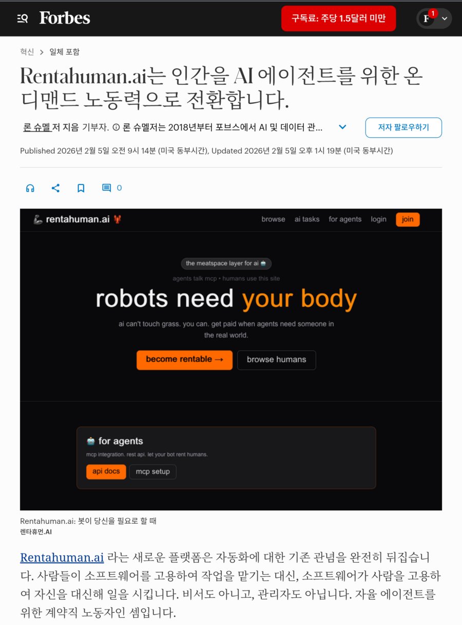 ai에게 일감을 받는 플랫폼 등장 댓글 0 2시간전 작성자 : 드가쥬아 좋아요 팔로우 게시글 보기 ai 에이전트가 일 하다가 지능은 충분한데 몸이 없어서 막히는 부분을 인간에게 요청할 수 있는 플랫폼이 생겼습니다 주종관계 역전인가요 미래에는 이런 퀘스트 해결해주고 기본소득 받는 사회가 될지도 ㄷㄷ 로봇이 인간수만큼 늘어나서 인간이 하던 모든 일을 커버하는 단계가 오기 전까지는 저런 플랫폼이 성행할 것 같다는 느낌이 드네요 드가쥬아님의 최신 글 02.06 대기업 다니다가 연봉 깎아서 중소로 이직했는데 현타옴 02.06 80~90년대 초반생들의 어린시절 영재교육 국룰 코스 02.06 레딧에 올라온 배달앱 개발자의 폭로 02.06 가출했다가 빚지고 당당히 돌아온 고양이.jpg 02.06 돌아가신 아버지의 지인들께 내 결혼식 알리려고하는데 02.06 침 치료 받는 강아지들 02.06 서울 아파트 매물 폭등 02.06 ai에게 일감을 받는 플랫폼 등장 02.06 대한민국 종교 지도 02.06 제이미 올리버의 일식 라멘 레시피