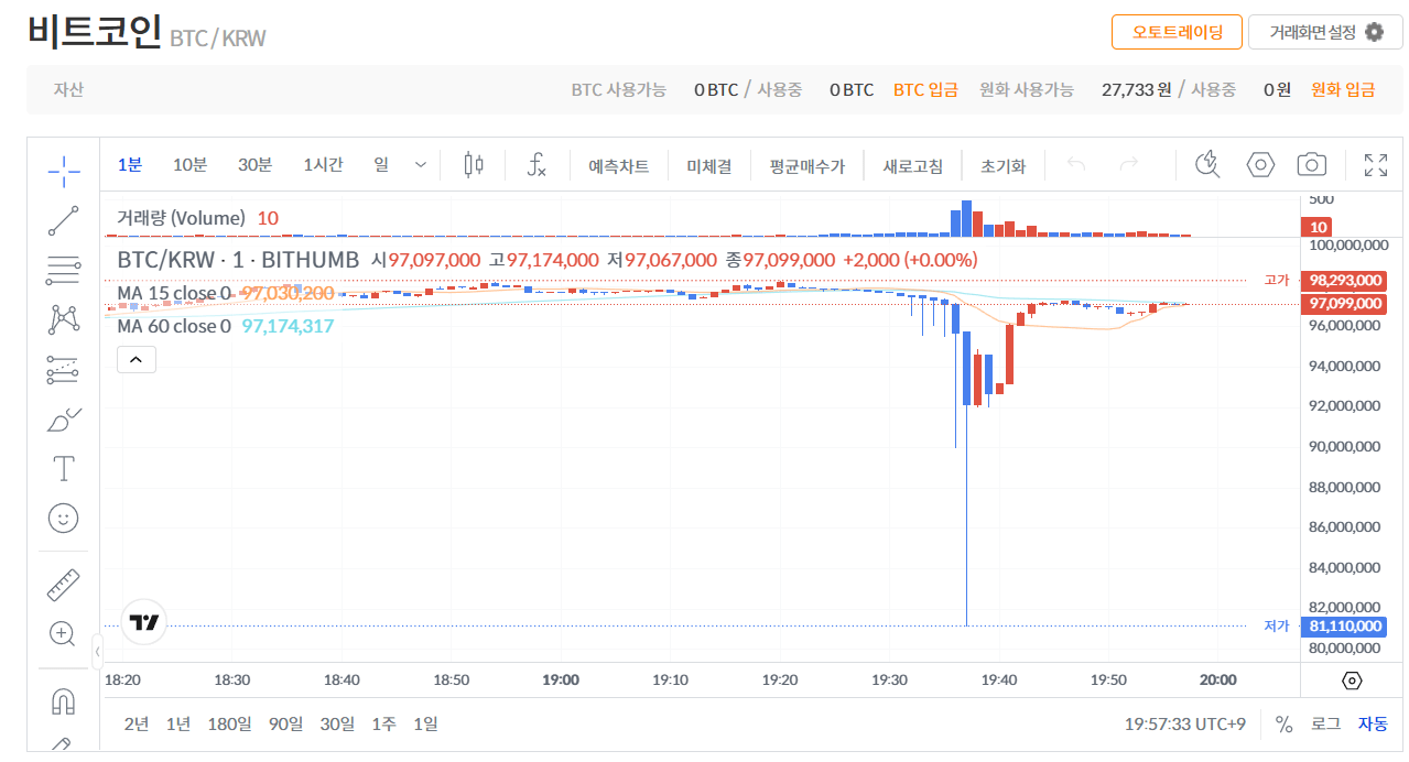 7시 35분부터 갑자기 빗썸에서만 비트코인이 분봉으로 -15% 급락함